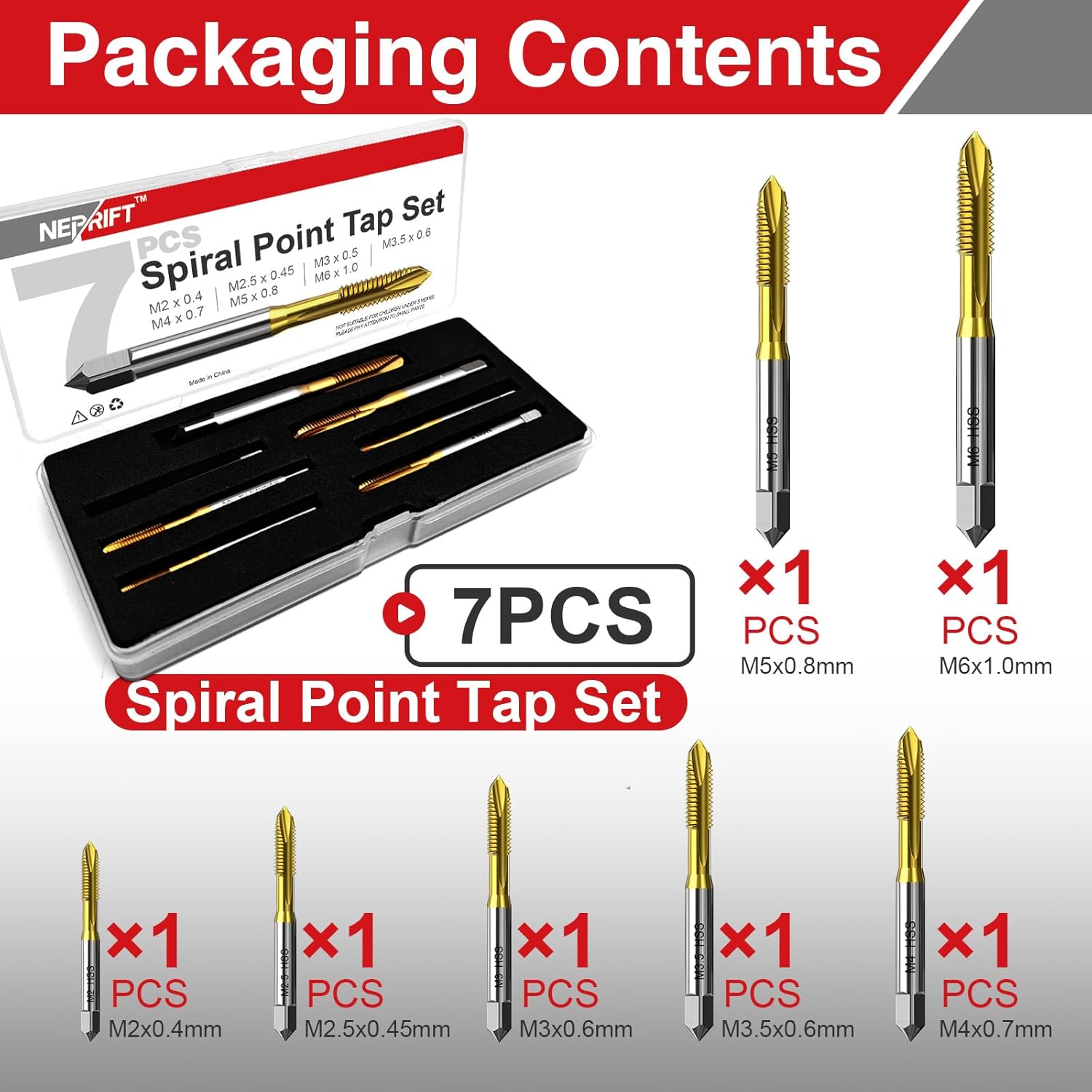 • Complete Metric Tap Set for Common Tasks This 7-piece spiral point tap set includes the most frequently used metric sizes: M2, M2.5, M3, M3.5, M4, M5, and M6. It is designed to handle a wide range of threading jobs, providing a versatile solution for creating new threads or cleaning up damaged ones in nuts, bolts, and fixtures